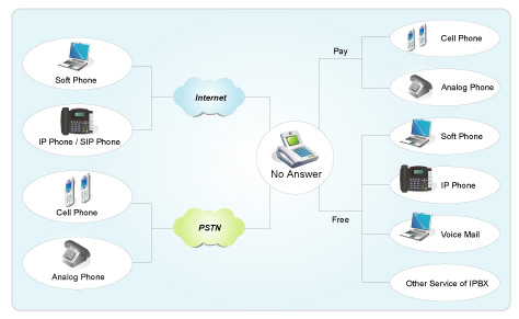 Essence IP-PBX的所有用戶均可透過內部撥號方式之設定( Dialing Plan)將話務在不改變撥號習慣之前提下,經由Internet導向外部ITSP服務商,再連接PSTN電話。