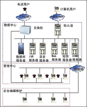 系統(tǒng)的體系結(jié)構,主要包括三個部分:數(shù)據(jù)中心、受理中心和維護中心。受理中心與數(shù)據(jù)中心之間采用E1連接,具有2M的數(shù)據(jù)通信能力;維護中心與數(shù)據(jù)中心之間采用64K DDN線路連接,三個中心分布在三個不同的地方。目前受理中心負責全省的所有業(yè)務,客戶通過本地市話經(jīng)由移動電信網(wǎng)絡將話路指向受理中心,通過數(shù)據(jù)中心的具有排隊功能的交換機,根據(jù)被叫號碼和客戶服務要求,將講話路轉(zhuǎn)接到自動臺或人工臺席,為客戶提供服務。當用戶呼叫信息臺電話后,進入到交換機,交換機將來話消息通知驅(qū)動池,驅(qū)動池將相關消息轉(zhuǎn)換為標準格式,通知CCMS,CCMS根據(jù)來話被叫號,根據(jù)管理系統(tǒng)的定義,啟動相應的IVR腳本,交給IVR解釋器解釋并由IVR服務器執(zhí)行,當服務為自動臺完成時,由IVR服務器實現(xiàn)(如:語音引導、適合自動服務的內(nèi)容等);當用戶需要人工服務時,CCMS管理系統(tǒng),根據(jù)用戶的服務要求,按照話路分配原則(通過管理系統(tǒng)定義),選擇最合適的話務員為其服務,同時CCMS管理系統(tǒng)會將相關的頁面在話務員的臺席上顯示出來,同時顯示主叫號碼以及來話標示,當話務員應答后,即可開始受理,受理的內(nèi)容通過Web服務器完成,同時對于需要查詢數(shù)據(jù)庫的訪問,通過應用服務器,進行數(shù)據(jù)訪問,并返回結(jié)果。當服務完畢,本次呼叫即結(jié)束。