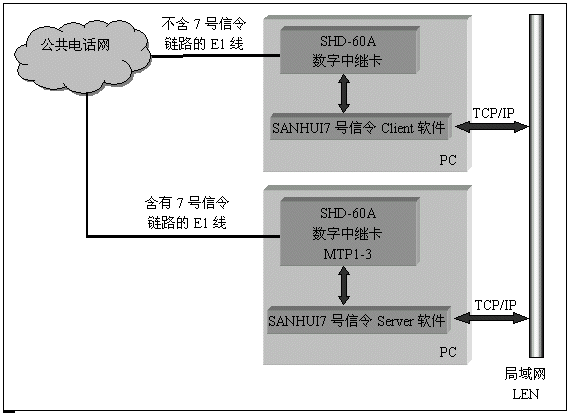 數(shù)字中繼卡上的DSP完成7號(hào)信令MTP第一至第三層的信令鏈路處理,由驅(qū)動(dòng)軟件完成TUP和ISUP層的協(xié)議處理,包含有7號(hào)信令鏈路的微機(jī)作為server,通過(guò)TCP/IP協(xié)議為其它不包含信令鏈路的client提供接續(xù)控制。