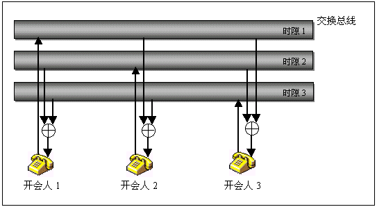 由于會(huì)議的資源是分布在各個(gè)通道,因此電話會(huì)議功能可以具有極大的靈活性,只有一塊卡的小系統(tǒng)也可以擁有電話會(huì)議功能,既可以召開(kāi)所有通道參加的大會(huì)議,也可以同時(shí)召開(kāi)一系列參加人數(shù)不同的小會(huì)議,會(huì)議功能的各項(xiàng)指標(biāo),如會(huì)議數(shù)目,會(huì)議參加人數(shù),發(fā)言人數(shù)等基本上都不受限制。下圖以一個(gè)三方會(huì)議的實(shí)現(xiàn)說(shuō)明分布式電話會(huì)議的概念。