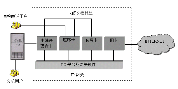 在PC機(jī)平臺(tái)內(nèi),可插入三種不同類型的語(yǔ)音卡,中繼卡用于連接企業(yè)原有的用戶交換機(jī),使得分機(jī)用戶可以通過(guò)IP網(wǎng)絡(luò)接打電話,中繼線可采用模擬線或數(shù)字中繼線、座席卡用于直接連接電話用戶,常用于沒(méi)有用戶交換機(jī)的場(chǎng)合;傳真卡用于完成IP網(wǎng)絡(luò)上的傳真中繼功能。所有的語(yǔ)音卡之間采用卡間交換總線相連,以便實(shí)現(xiàn)互相通話和傳真資源共享。PC平臺(tái)內(nèi)一般還需要網(wǎng)卡實(shí)現(xiàn)與INTERNET的連接。網(wǎng)關(guān)軟件是該IP網(wǎng)關(guān)的關(guān)鍵部分,完成對(duì)語(yǔ)音卡的控制和IP協(xié)議處理。