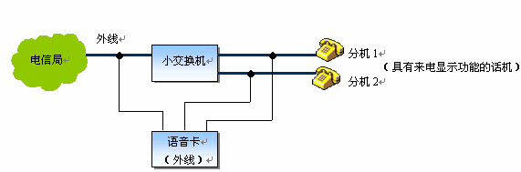 說明:將語音卡的外線通道并接在小交換機(jī)的全部內(nèi)外線端口上,在軟件的控制下,不僅可以將外線來電號碼轉(zhuǎn)發(fā)至分機(jī),并且還可以在內(nèi)線通話時,看到通話對方的號碼,非常實(shí)用。當(dāng)然,如果直接采用語音卡(外線+座席)來構(gòu)成小交換機(jī),則系統(tǒng)更為簡潔,成本也大為降低。