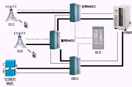 移動網(wǎng)絡(luò)CRBT解決方案主要由網(wǎng)關(guān)移動業(yè)務(wù)交換中心(GMSC),移動業(yè)務(wù)交換中心(MSC),歸屬位置寄存器(HLR),CRBT平臺等部分組成,其中需要使用GMSC實現(xiàn)與它網(wǎng)交換機進行互聯(lián),網(wǎng)絡(luò)拓撲圖如下: