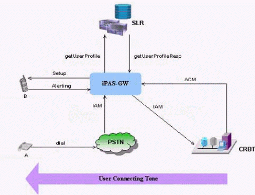 以UT斯達康的iPAS網(wǎng)絡(luò)為例進行說明,被叫端局的iPAS-GW 可根據(jù)用戶的屬性決定用戶是否訂閱CRBT業(yè)務(wù),如果被叫用戶訂閱了該項業(yè)務(wù),則 iPAS-GW 將呼叫轉(zhuǎn)到CRBT平臺,由該平臺在被叫號碼前加撥特殊前綴后繼續(xù)向iPAS-GW發(fā)起新的呼叫,同時根據(jù)主叫號碼所選擇個性化鈴聲向主叫用戶放音,而iPAS-GW則直接接續(xù)被叫小靈通用戶,當被叫用戶摘機后,CRBT平臺負責(zé)將主、被叫接通,也就是說在通話過程中始終要占用CRBT平臺的話路資源和 iPAS-GW 的中繼資源。如下圖所示: