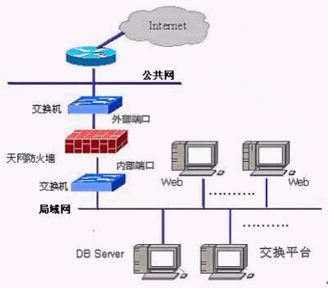 對整個系統(tǒng)網(wǎng)絡(luò)的保護首先要從保護內(nèi)部網(wǎng)絡(luò)避免受到Internet網(wǎng)上的攻擊為主,可以采用高可靠性的防火墻作為主要手段,網(wǎng)絡(luò)拓撲圖如下圖所示: