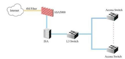 辦公專用網通過一條4M光纖線路連入CNC網絡,在酒店內部安裝了ASA5000和ISA等安全管理設備,ISA承擔了NAT等功能;辦公網的信息點數量大概在200個左右。