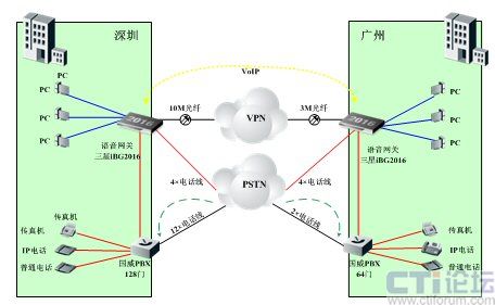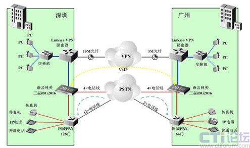 A公司總部設在深圳,在廣州有分公司。深圳總部目前已有10M光纖到樓作為總出口帶寬,已安裝1臺支持VPN功能的Linksys路由器;語音方面,已申請了16條電話線,并安裝1臺國威128門PBX;廣州也引入了3M光纖作為出口帶寬,和6條電話線作為PSTN外線,已安裝1臺支持VPN功能的Linksys路由器和1臺國威64門PBX。深圳、廣州兩地公司已建立了VPN隧道,以提供有安全保障的數據網絡平臺。