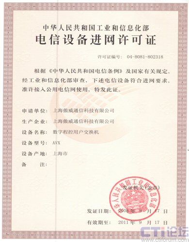近日,國(guó)內(nèi)知名的VOIP全系列產(chǎn)品和解決方案提供商---傲威通信科技有限公司,自主研發(fā)的AVX系列語音電話交換機(jī)順利通過工業(yè)與信息化部審核,取得“電信設(shè)備進(jìn)網(wǎng)許可證”。此舉標(biāo)志著傲威通信的AVX系列產(chǎn)品已成功取得接入國(guó)家電信網(wǎng)的資質(zhì),為大規(guī)模的推廣應(yīng)用打下了堅(jiān)實(shí)基礎(chǔ)。