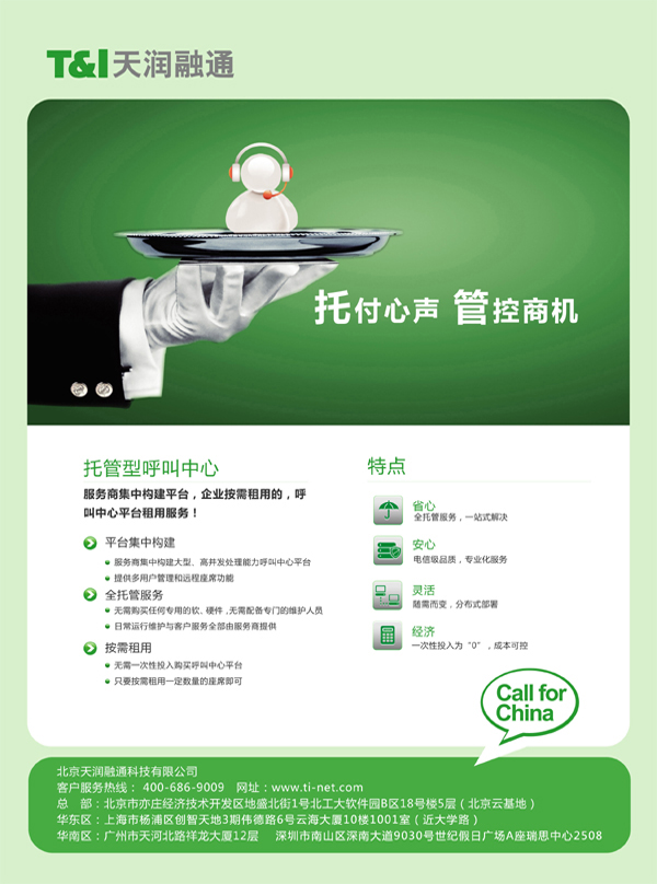 北京天潤融通科技有限公司致力于為企業(yè)提供簡單、易用、可依靠的托管型呼叫中心服務,幫助企業(yè)更好地經(jīng)營其客戶資源。天潤融通是國內(nèi)呼叫中心領域內(nèi)領先的“云應用”提供者。先后承接了百度全國客服中心、平安保險北京客服中心、慧聰網(wǎng)呼叫中心、央視網(wǎng)絡客服中心、安博教育客服中心、圓通快遞客戶服務中心、飯統(tǒng)網(wǎng)客戶訂餐中心等大型的呼叫中心項目。服務的客戶遍及互聯(lián)網(wǎng)、教育培訓、金融服務、旅游票務、電子商務、食品飲料、醫(yī)療保健、消費品制造和銷售、物流、餐飲娛樂、電視購物等十多個領域達數(shù)千家企業(yè)客戶。