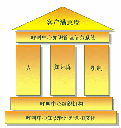如上圖呼叫中心知識管理大廈。其是建立在呼叫中心知識管理理念文化、組織機構基礎上,以人、知識庫、機制為核心,通過呼叫中心知識管理信息系統(tǒng)承載實施,以提高客戶滿意度為目的的綜合系統(tǒng)。