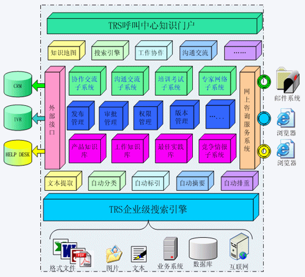 TRS Call Center 知識管理系統(tǒng)構建在TRS企業(yè)級搜索引擎之上,融合了TRS文本挖掘技術和內(nèi)容管理技術,全面包括知識庫、競爭情報、專家網(wǎng)絡、培訓考試、溝通交流和協(xié)作交流六大子系統(tǒng),以及發(fā)布管理、審批管理、權限管理、版本控制等系統(tǒng)管理模塊;并集成面向用戶的網(wǎng)上咨詢服務系統(tǒng),提供面向客戶管理信息系統(tǒng)(CRM)、自動語音應答系統(tǒng)(IVR)、Help