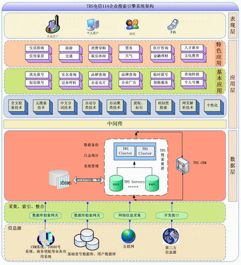 TRS公司結(jié)合電信行業(yè)114業(yè)務(wù)應(yīng)用需求,依托自身企業(yè)搜索引擎產(chǎn)品和中文信息處理技術(shù),推出的的電信114企業(yè)搜索引擎解決方案,能夠全面整合索引搜索電信114業(yè)務(wù)應(yīng)用的信息內(nèi)容,并向用戶提供高效的、準(zhǔn)確的、安全的、個(gè)性化的搜索體驗(yàn)。其框架圖如下: