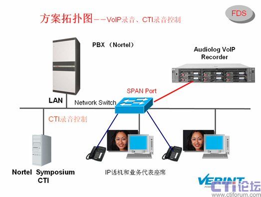 Audiolog錄音系統(tǒng)能和Nortel交換機(jī)、Symposium CTI進(jìn)行整合,獲取CTI隨路數(shù)據(jù)便于用戶錄音資料檢索。