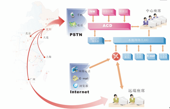 對于地區(qū)分布廣泛,而又要集中管理的企業(yè),可在各個局部地區(qū)設(shè)置遠端座席,并通過網(wǎng)絡(luò)方便的接入中心系統(tǒng)。我們?yōu)檫h端座席提供與中心座席完全相同的操作,遠端座席可以根據(jù)各個地區(qū)的特定情況有針對性的處理各個局部地區(qū)的業(yè)務(wù),為中心分流壓力,同時中心系統(tǒng)也可以完全掌握遠端座席的情況。我們可以非常明確的一點是:采用分布式座席的技術(shù),使得遠端座席與中心座席除了地域上的差異,其它部分完全相同。可以說只要網(wǎng)絡(luò)無極限,座席分布就是無極限的。