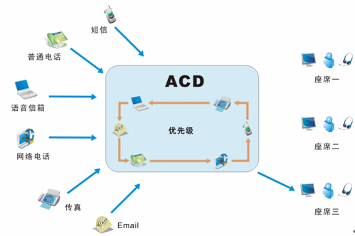 我們目前接入的媒體有很多,不再是傳統(tǒng)的單一電話接入方式,還包括網(wǎng)絡(luò)呼入、E-mail呼入,短信、留言等,所有的媒體接入都通過統(tǒng)一的排隊路由,以最優(yōu)化的策略分配給最適合的座席人員;并且,不同的媒體類型具有不同的優(yōu)先級,ACD(自動話務(wù)分配)根據(jù)優(yōu)先級和設(shè)定的排隊算法,自動實現(xiàn)媒體的統(tǒng)一智能路由。