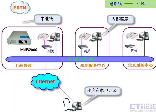 由于底層對(duì)VOIP的支持,MVB2000 系統(tǒng)除提供本地人工座席以外,還可以根據(jù)需要接入遠(yuǎn)程座席。主要應(yīng)用形式有(1)接入集中,座席分布;(2)接入分布,座席集中;(3)接入分布,座席分布。