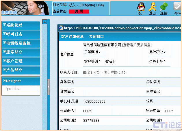 當(dāng)客戶來(lái)電轉(zhuǎn)接人工服務(wù)時(shí),自動(dòng)彈出信息登記窗口并根據(jù)來(lái)電號(hào)碼檢查客戶資料庫(kù)中是否有該客戶的數(shù)據(jù)。如客戶的名稱、地址、聯(lián)系電話、身體狀況、膚色、以往的咨詢、投訴等記錄信息。以及來(lái)電日期、時(shí)間、受理人等;使座席人員一目了然,第一時(shí)間了解來(lái)電的相關(guān)信息。