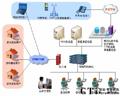 隨著國(guó)內(nèi)城市化地不斷加快,人口老齡化的加劇,人民群眾對(duì)家政服務(wù)需求也越來(lái)越旺盛,家政服務(wù)業(yè)的重要性也日益凸顯。為了規(guī)范家政服務(wù)市場(chǎng)、整合家政市場(chǎng)資源、培育家政服務(wù)示范性企業(yè),國(guó)家商務(wù)部、財(cái)務(wù)部于2009年4月下發(fā)了《關(guān)于推進(jìn)家政服務(wù)網(wǎng)絡(luò)體系建設(shè)的通知》的149號(hào)文件,啟動(dòng)了家政服務(wù)網(wǎng)絡(luò)中心體系建設(shè)的項(xiàng)目,并提出了具體的規(guī)范和要求。以此為起點(diǎn),為更好地服務(wù)社會(huì)滿(mǎn)足人民群眾日益增長(zhǎng)的生活需求而努力。自文件下發(fā)以來(lái),我公司就組織專(zhuān)門(mén)的項(xiàng)目組,對(duì)家政服務(wù)行業(yè)具體業(yè)務(wù)需求的調(diào)研以及開(kāi)發(fā)工作。公司利用多年的開(kāi)發(fā)經(jīng)驗(yàn),經(jīng)過(guò)幾個(gè)月的努力,終于在8月份完成了暢信達(dá)家政服務(wù)網(wǎng)絡(luò)中心的全套建設(shè)方案。與其它系統(tǒng)固化的功能設(shè)計(jì)不同,該方案可以靈活地定制業(yè)務(wù)模塊,方便各地的家政公司根據(jù)本市的情況和需求,確定適合自身的業(yè)務(wù)流程。系統(tǒng)業(yè)務(wù)模塊完整地覆蓋了家政服務(wù)的業(yè)務(wù)范圍與重點(diǎn)。并將家政服務(wù)的業(yè)務(wù)分為營(yíng)業(yè)系統(tǒng)、賬務(wù)系統(tǒng)、后臺(tái)系統(tǒng)等部分,貫穿了市民從訴求提交、工單派發(fā)、工單處理、財(cái)務(wù)結(jié)算到回訪反饋的各個(gè)方面。系統(tǒng)還提供了完善的報(bào)表模塊準(zhǔn)確反映業(yè)務(wù)和系統(tǒng)運(yùn)營(yíng)狀況,有力地支持對(duì)平臺(tái)進(jìn)行運(yùn)營(yíng)管理工作。另外在方案設(shè)計(jì)上,除了滿(mǎn)足業(yè)務(wù)處理需要外,還充分考慮到系統(tǒng)的適應(yīng)性、穩(wěn)定性和處理的能力。首先為了滿(mǎn)足各地市對(duì)家政平臺(tái)的不同需求,公司專(zhuān)門(mén)推出了基于IBM服務(wù)器的和暢信達(dá)標(biāo)配服務(wù)器的兩種建設(shè)方案。暢信達(dá)標(biāo)配服務(wù)器方案可提供最低4模擬外線最多1條數(shù)字中繼(E1)接入,適用于初期規(guī)模較小且投資規(guī)模不大的客戶(hù)。而基于IBM服務(wù)器的方案,則主要是滿(mǎn)足業(yè)務(wù)量較大,同時(shí)對(duì)設(shè)備配置要求高的城市,以數(shù)字線接入為主。多種建設(shè)模式充分體現(xiàn)了方案的靈活性、可擴(kuò)展性的特征,有效地減少了運(yùn)營(yíng)風(fēng)險(xiǎn),提升了個(gè)性化定制化服務(wù)的水平。其次,根據(jù)家政市場(chǎng)需求預(yù)測(cè)以及已開(kāi)通家政服務(wù)網(wǎng)絡(luò)中心城市的實(shí)際運(yùn)營(yíng)情況,一個(gè)中型城市,預(yù)計(jì)電話開(kāi)通之后,話務(wù)量平均每天近3000個(gè),這就要求系統(tǒng)不但有穩(wěn)定的性能而且要有強(qiáng)大的處理能力。我公司從系統(tǒng)平臺(tái)構(gòu)建、業(yè)務(wù)流程設(shè)計(jì)、設(shè)備性能、組網(wǎng)設(shè)計(jì)等方面著手,為系統(tǒng)提供了足以確保安全穩(wěn)定運(yùn)行的支持。
