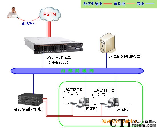 鄭州交運服務熱線采用暢信達通信MVB2000系統(tǒng)作為交換平臺,采用企業(yè)級智能路由語音網(wǎng)關結合話機作為座席終端,系統(tǒng)共接入數(shù)字中繼線4條(4E1),座席分機90臺,系統(tǒng)通過內(nèi)部局域網(wǎng)組網(wǎng),系統(tǒng)架構形式如下: