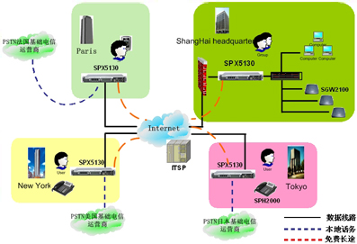 隨著公司在全世界開設眾多的部門,IP電話技術將會是不同分公司之間實現(xiàn)低費用高品質(zhì)語音通訊的方式。SINOCO公司的IP-PBX 系統(tǒng)解決方案,利用 SPX-5130設備通過互連網(wǎng)連接到公司的各個分支機構,提供分級體系結構,更進一步提供了可靠的,靈活的語音通訊解決方案,從而滿足公司快速回應客戶的需求。同時,它也降低了總部和分部之間的電話費用?偛亢头植块g昂貴的國際電話費用將不再存在, 而且享受高品質(zhì)的語音通訊質(zhì)量。