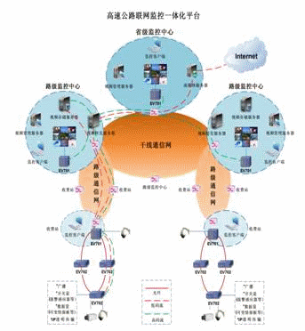 高速公路聯(lián)網(wǎng)監(jiān)控系統(tǒng)是把路段實(shí)時(shí)視頻圖像、交通流量數(shù)據(jù)、路段封閉情況、交通事故情況、氣象數(shù)據(jù)、隧道內(nèi)環(huán)境數(shù)據(jù)、各外場(chǎng)設(shè)備工作狀態(tài)、各種告警異常以及施工情況等即時(shí)信息進(jìn)行編輯匯總,通過通信網(wǎng)絡(luò)實(shí)時(shí)上傳到路段監(jiān)控中心、監(jiān)控分中心和省級(jí)監(jiān)控中心,省中心對(duì)采集的各種數(shù)據(jù)進(jìn)行統(tǒng)計(jì)分析處理,以表格和曲線顯示,對(duì)各外場(chǎng)設(shè)備的工作狀態(tài)以圖標(biāo)顯示,并通過發(fā)布控制指令給相應(yīng)分中心監(jiān)控系統(tǒng),對(duì)可變情報(bào)板,可變限速標(biāo)志等交通誘導(dǎo)設(shè)備進(jìn)行控制,以此方便行路者了解最新路況,使管理者能夠監(jiān)控實(shí)時(shí)路況信息,達(dá)到使用與監(jiān)控的統(tǒng)一。