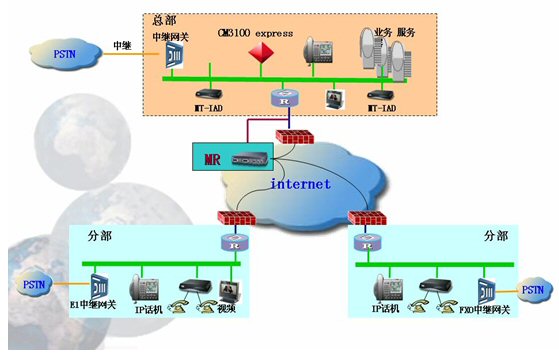 由于電信運(yùn)營(yíng)商的線路租賃費(fèi)用非常昂貴,對(duì)于中小企業(yè)來說是一項(xiàng)不小的負(fù)擔(dān),所以中小企業(yè)的組網(wǎng)方式一般采用ADSL方式,來降低費(fèi)用,而ADSL的組網(wǎng)方式往往都經(jīng)過了幾層地址轉(zhuǎn)換了,這樣在分部或分支機(jī)構(gòu)的IP電話終端就無法穿透防火墻,實(shí)現(xiàn)和外面成功通話,所以需要在總部配置1臺(tái)媒體路由器(MR)來做語(yǔ)音代理,完成呼叫連接的建立。
