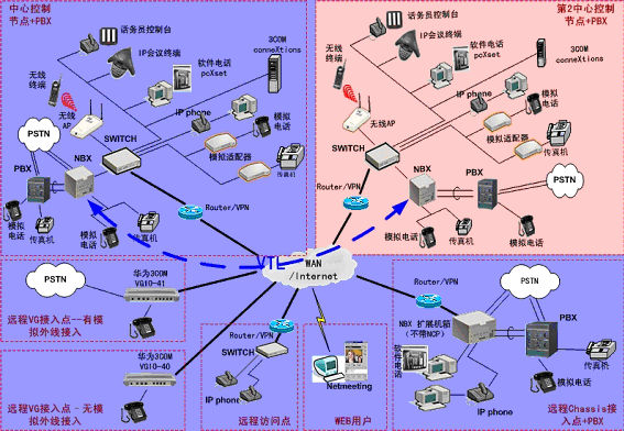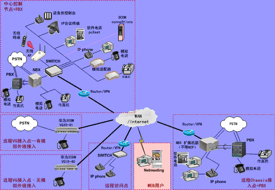 ②.統(tǒng)一的分支機構電話平臺,可以支持任何數(shù)據骨干網(WAN)技術,包括DDN、幀中繼、VPN、xDSL等。3COM NBX 系統(tǒng)也可以在無線局域網上運行。