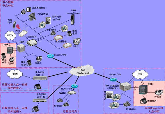 ③.遠(yuǎn)程接入的辦公室不再需要專用的 PBX, 只需要將3Com NBX電話終端接入到WAN網(wǎng)中,就能地實(shí)現(xiàn)在WAN或Internet上與3Com