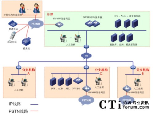 總部部署呼叫中心,NV-IPS呼叫中心平臺采用純IP部署方式,可根據(jù)用戶的實際環(huán)境,靈活部署,各設備模塊不受地理位置的限制,降低整體平臺的部署成本。