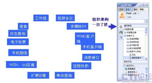 UcSTAR :Unified Communication Star,是深圳市擎旗信息技術(shù)有限公司推出的企業(yè)級(jí)融合通信平臺(tái)。是融合多種通訊手段(IM、文件、視頻、語(yǔ)音、EMAIL、SMS、電話、VOIP、MSN/QQ互通),融合企業(yè)的多種應(yīng)用系統(tǒng)緊密集成(OA、CMS、ERP、EIP、Portal、網(wǎng)站、應(yīng)用軟件),交流對(duì)象和交流內(nèi)容可管理,可控制,可擴(kuò)展,輕松實(shí)現(xiàn)部署企業(yè)的統(tǒng)一工作平臺(tái)。 UcSTAR能統(tǒng)一消息、統(tǒng)一溝通、統(tǒng)一管理、隨意選擇多種溝通手段,深航一直在找這樣的一種產(chǎn)品,公司信息部門從上到下給予極高的重視,商務(wù)的過(guò)程也都開(kāi)了綠燈,一路順暢。