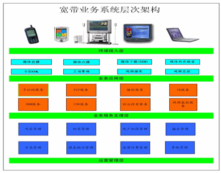 提供多種寬帶業(yè)務(wù)產(chǎn)品包,如網(wǎng)絡(luò)卡拉OK業(yè)務(wù),持網(wǎng)絡(luò)視頻播客業(yè)務(wù),網(wǎng)絡(luò)視寬頻視野業(yè)務(wù),也可根據(jù)用戶(hù)需求定制拓展業(yè)務(wù)如遠(yuǎn)程教學(xué)業(yè)務(wù),網(wǎng)絡(luò)音像發(fā)行出版業(yè)務(wù)(數(shù)字版權(quán)保護(hù)),網(wǎng)絡(luò)電視臺(tái)業(yè)務(wù),多媒體辦公業(yè)務(wù)等。