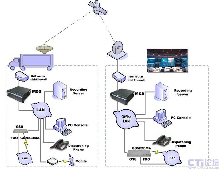 Zed-3的車(chē)載調(diào)度系統(tǒng)支持多種接口,通過(guò)無(wú)線網(wǎng)關(guān)提供的GSM、CDMA或模擬中繼端口,可以實(shí)現(xiàn)與固定電話、手機(jī)等外部電話的互通。即使在現(xiàn)場(chǎng)沒(méi)有任何可用的外線資源,例如沒(méi)有模擬電話接口,手機(jī)卡沒(méi)有信號(hào),也仍然可以通過(guò)衛(wèi)星鏈路將呼叫連接到指揮中心的網(wǎng)關(guān)設(shè)備再落地,最大可能的保證現(xiàn)場(chǎng)調(diào)度系統(tǒng)與外部電話的通信。