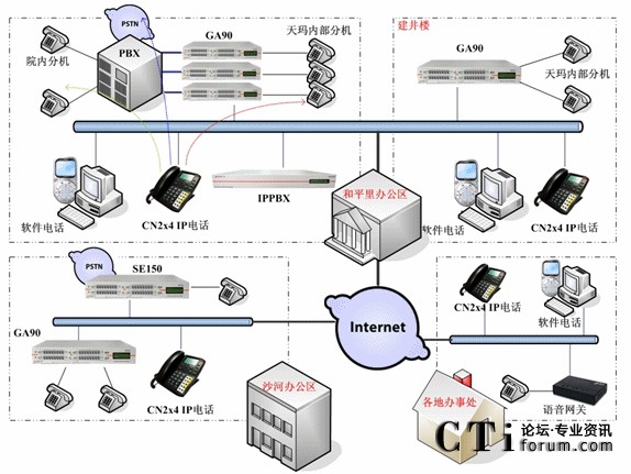 具體情況是:和平里的總部與沙河辦公區(qū)之間為網(wǎng)絡(luò)專線,并有公網(wǎng)出口。各辦事處使用ADSL撥號上網(wǎng)方式?偛康姆桨冈O(shè)計(jì)中,使用了5臺(tái)GA90網(wǎng)關(guān),兩臺(tái)IPPBX以及多部IP話機(jī)和軟件電話。和平里辦公區(qū)工位數(shù)量為120左右,其中多數(shù)工位需要部署模擬話機(jī),個(gè)別工位屬于非固定的移動(dòng)工位,需要部署CN2x4