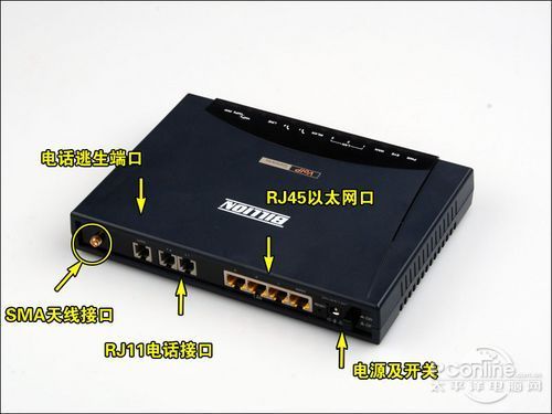 BiPAC 6404VGP后面接口板除了和普通無(wú)線路由器一樣有1個(gè)WAN接口,4個(gè)LAN接口外,還多出了三個(gè)RJ11的電話接口,這個(gè)就是用來連接傳真機(jī)或電話機(jī)的。此外,考慮到BiPAC 6404VGP的無(wú)線功能在企業(yè)中應(yīng)用需要有較大的信號(hào)覆蓋范圍,所以它還提供了一個(gè)SMA天線接口可用來連接高增益天線。
