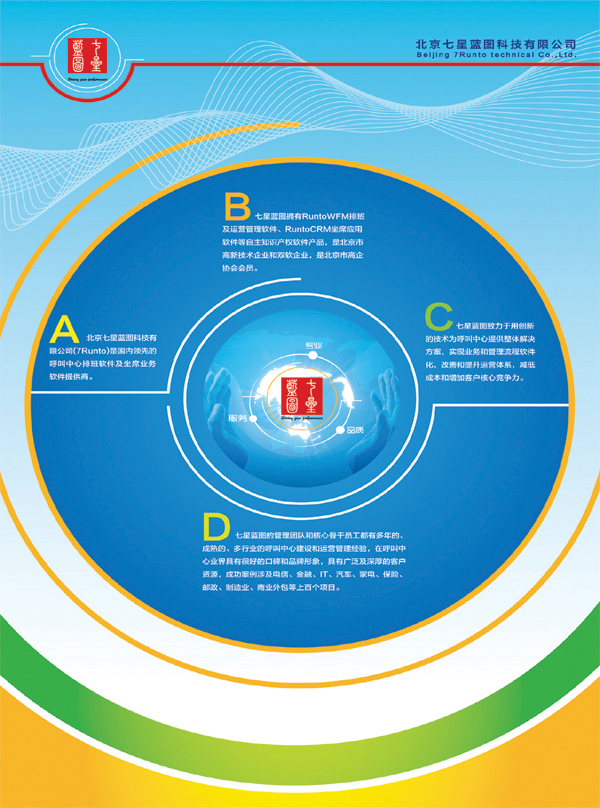 北京七星藍(lán)圖科技有限公司(7Runto)是一家專業(yè)開發(fā)和提供呼叫中心排班管理軟件、運(yùn)營管理系統(tǒng)、座席應(yīng)用軟件的服務(wù)商,是北京市高新技術(shù)企業(yè)和雙軟企業(yè),是北京市高企協(xié)會(huì)會(huì)員。七星藍(lán)圖擁有自主知識(shí)產(chǎn)權(quán)的產(chǎn)品RuntoCRM、RuntoWFM等,致力于用創(chuàng)新的技術(shù)和服務(wù),為客戶提供呼叫中心業(yè)務(wù)及運(yùn)營管理整體解決方案,幫助客戶實(shí)現(xiàn)業(yè)務(wù)流程和管理流程軟件化,改善和提升運(yùn)營體系,減低成本和增加客戶核心競(jìng)爭(zhēng)力。