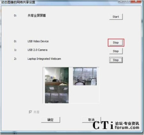 打開動態(tài)圖像網(wǎng)絡(luò)共享圖像設(shè)置列表,可以看到共享全屏屏幕下面有3個(gè)不同的顯示,這表示在這臺電腦上一共插了3個(gè)攝像機(jī),點(diǎn)擊顯示欄右側(cè)的“start”,就可以把攝像機(jī)的圖像設(shè)置為共享的圖像,這3個(gè)攝像機(jī)可以同時(shí)共享,也可以只設(shè)置其中的某一個(gè)。點(diǎn)擊“start”后按鈕就會變?yōu)椤皊top”,這時(shí)攝像機(jī)所獲取到得圖像也會在列表中顯示。下圖是將3個(gè)攝像機(jī)都設(shè)為共享的圖像的效果: