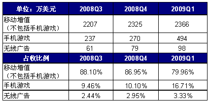 2009年第1季度,空中網(wǎng)手機(jī)游戲服務(wù)營(yíng)收為494萬美元,同比增長(zhǎng)304%,環(huán)比增長(zhǎng)83%;其中手機(jī)網(wǎng)游的營(yíng)收為72萬美元,同比增長(zhǎng)379%,環(huán)比增長(zhǎng)11%,單機(jī)游戲和WAP頁(yè)面游戲的服務(wù)營(yíng)收為422萬美元,同比增長(zhǎng)293%,環(huán)比增長(zhǎng)106%。手機(jī)游戲業(yè)務(wù)在空中網(wǎng)銷售收入中所占比重由2008年第4季度的10.10%上漲至16.71%。