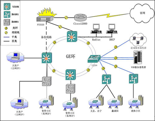 此城域網結構清晰,由核心層的三層交換機只負責數據的快速轉發(fā),對業(yè)務匯聚和用戶的認證控制任務全部由接入服務器R4000來完成。要求接入服務器支持多種認證手段、加強對各類用戶實現不同級別的控制、為用戶的訪問提供安全保障措施、結合Radius系統(tǒng)提供多種計費功能。