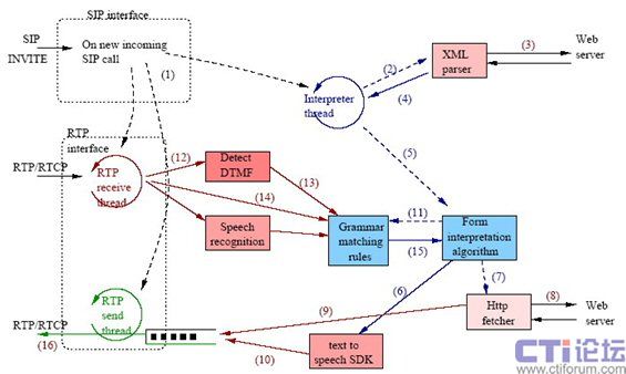 1. 當(dāng)瀏覽器接收到一個新進(jìn)來的SIP呼叫后,它創(chuàng)建三個不同線程:RTP接收線程、RTP發(fā)送線程和VoiceXML解釋器線程。RTP接收線程從主叫方接收媒體數(shù)據(jù)包并調(diào)用DTMF檢測模塊;RTP發(fā)送線程將媒體數(shù)據(jù)包以流的方式發(fā)送給主叫方。一個單獨的發(fā)送線程幫助維護(hù)外出數(shù)據(jù)報的固定帶寬(比如針對G.711音頻的64