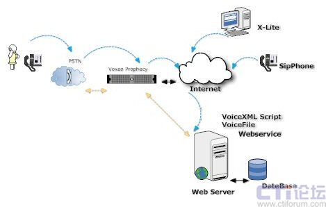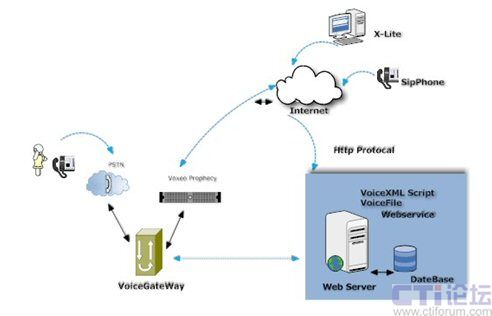 Voxeo Prophecy 是一個(gè)基于SIP、VoiceXML、CCXML標(biāo)準(zhǔn)的語(yǔ)音應(yīng)用開(kāi)發(fā)和部署平臺(tái),可以讓用戶快速高效的實(shí)施自己的IVR系統(tǒng)。大家都知道,傳統(tǒng)的IVR解決方案廠商,IVR系統(tǒng)架構(gòu)都是基于傳統(tǒng)的CTI硬件來(lái)實(shí)現(xiàn)的,無(wú)論是交換機(jī)方式還是語(yǔ)音卡方式,都是脫離不開(kāi)硬件廠家的媒體資源。Voxeo Prophecy 是完全基于互聯(lián)網(wǎng)SIP 協(xié)議,同時(shí)也是VoiceXML標(biāo)準(zhǔn)的聯(lián)盟成員,不受任何硬件廠家的硬件限制。VoiceXML 是一種標(biāo)準(zhǔn)的標(biāo)記語(yǔ)言,用于建立語(yǔ)音界面,好比是我們所熟知的HTML 語(yǔ)言,Voxeo Prophecy 可以理解為傳統(tǒng)的語(yǔ)音瀏覽器,可以解釋VoiceXML 腳本并向用戶顯示語(yǔ)音信息,也可以接受用戶的語(yǔ)音請(qǐng)求,實(shí)現(xiàn)互動(dòng)。如下圖所示: