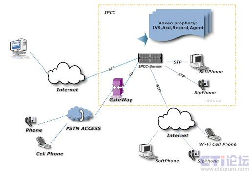 近期,行業(yè)內(nèi)不同的廠商都相繼推出了各自的應用解決方案。其實統(tǒng)一通信和IPCC有著很明顯的區(qū)別,IPCC(基于VOIP的呼叫中心)更側(cè)重于為企業(yè)提供Inbound和Outbound服務,是結(jié)合該企業(yè)的業(yè)務系統(tǒng)一起來運作的。但從技術(shù)的實現(xiàn)上兩者有著共同點,比如整個系統(tǒng)架構(gòu)都可以是基于SIP標準協(xié)議、多種不同網(wǎng)絡(luò)的接入方式等等。Voxeo利用自身的技術(shù)優(yōu)勢為客戶提供一種純軟件的IPCC開發(fā)平臺,如下圖所示: