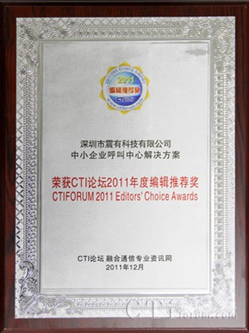 震有科技榮獲CTI論壇頒發(fā)的2011年度編輯推薦獎(jiǎng)