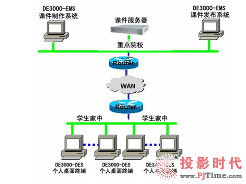 將全省各地市級(jí)院校與區(qū)縣級(jí)院;蛩搅⒃盒_B接起來,組成一個(gè)相對(duì)簡單卻有效的遠(yuǎn)程教育網(wǎng)絡(luò),使教學(xué)水平相對(duì)落后地區(qū)的學(xué)生能方便地享用遠(yuǎn)程教育網(wǎng)所提供的優(yōu)秀教育資源,通過實(shí)時(shí)授課、課件學(xué)習(xí)等方式極大的方便學(xué)生學(xué)習(xí),提高成績?紤]到區(qū)縣級(jí)院校的教學(xué)水平和經(jīng)費(fèi)問題,可以在各地市級(jí)院校配置CNKaran的DE3000-UES遠(yuǎn)程教育產(chǎn)品。而在區(qū)縣級(jí)院校只配置一臺(tái)PC加攝象頭,來實(shí)現(xiàn)遠(yuǎn)程授課或遠(yuǎn)程教學(xué)培訓(xùn)。