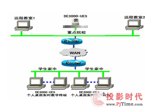 如上圖所示:DE3000系列中的DE3000-CES(個(gè)人桌面實(shí)時(shí)教學(xué)終端)主要用于學(xué)生在家里的PC上與學(xué)校的老師進(jìn)行實(shí)時(shí)的面對(duì)面授課。在學(xué)校的多媒體教室配備DE3000-UES(遠(yuǎn)程教育終端設(shè)備),在學(xué)生家中的電腦上安裝DE3000-CES(個(gè)人桌面實(shí)時(shí)教學(xué)終端),即可實(shí)現(xiàn)遠(yuǎn)程實(shí)時(shí)授課,其高質(zhì)量的音視頻效果與強(qiáng)大的數(shù)據(jù)功能,使學(xué)生猶如坐在教室里上課一樣,可體現(xiàn)出強(qiáng)烈現(xiàn)場(chǎng)感。