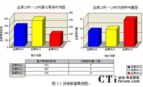 從報(bào)表數(shù)據(jù)庫的相應(yīng)表中,可以看出報(bào)表需要統(tǒng)計(jì)的數(shù)據(jù)信息都以表單形式列出來。圖中的Time Key表示收集數(shù)據(jù)的具體時(shí)刻,object_id表示目標(biāo)對象在配置數(shù)據(jù)庫中存儲的ID號。MaxTimeWaiting和Total_Calls屬性對應(yīng)的是根據(jù)模板項(xiàng)要求統(tǒng)計(jì)的數(shù)據(jù),分別為最大等待時(shí)間和內(nèi)線呼叫總量。下面利用報(bào)表展現(xiàn)工具可以直接將該數(shù)據(jù)展示出來,生成需要的報(bào)表。