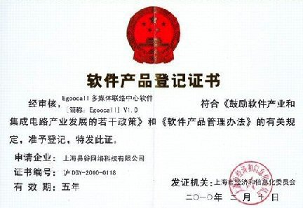 CTI論壇(ctiforum)3月8日消息(記者 袁青): 由易谷網(wǎng)絡(luò)自行研發(fā)的“Egoocall多媒體聯(lián)絡(luò)中心軟件”,于2010年2月10日通過上海市經(jīng)濟(jì)和信息化委員會(huì)審核,獲頒“軟件產(chǎn)品登記證書”。(證書號(hào):滬DGY-2010-0118)