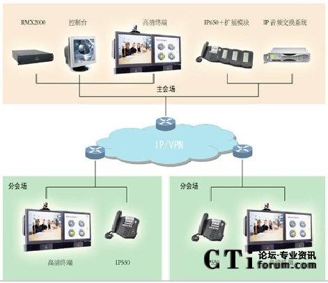 每個會場分配一個專用的IP地址,終端設(shè)置一部Polycom IP550電話, 在中心會場的指揮電話及擴展模塊上設(shè)置每個分會場快速呼叫功能鍵,中心會場的管理人員只需按下IP650及擴展模塊上的對應(yīng)于各分會場的快捷按鍵,即可迅速接通各個分會場。