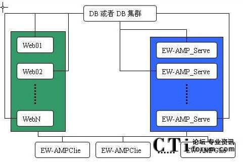 EW-AMP中間件在應(yīng)用中,可以配置多臺EW-AMP Server服務(wù)器由EW-AMP應(yīng)用集群技術(shù)組成EW-AMP Server集群,也可以配置多臺客戶的Web應(yīng)用(如CRM,MIS等)由EW-AMP