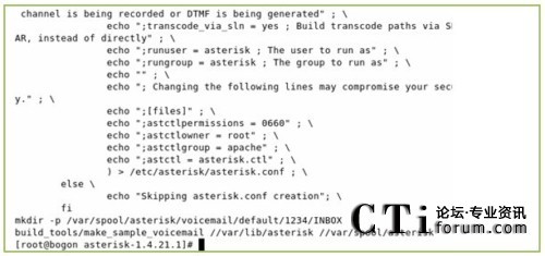 下圖為運(yùn)行上述命令的輸出,從輸出我們可以發(fā)現(xiàn)一個(gè)問(wèn)題,(使用本文的所用的軟件版本可能會(huì)出現(xiàn)的一個(gè)問(wèn)題,其他的版本不一定會(huì)出現(xiàn)),/etc/asterisk/zapata-channels.conf