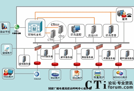 系統(tǒng)主要包含IVR服務(wù)器,CTI服務(wù)器,短信網(wǎng)關(guān),郵件服務(wù)器,傳真服務(wù)器,數(shù)據(jù)庫(kù)服務(wù)器,座席系統(tǒng)等。客戶撥打特服號(hào)碼接入廣電公司客服系統(tǒng),首先由IVR提供自動(dòng)語(yǔ)音服務(wù)。CTI服務(wù)器負(fù)責(zé)所有的電話的路由、排隊(duì)、轉(zhuǎn)接和控制?蛻粼诮邮茏詣(dòng)語(yǔ)音服務(wù)時(shí),如果需要人工幫助,可選擇轉(zhuǎn)入人工座席。由IVR系統(tǒng)向CTI發(fā)出轉(zhuǎn)接請(qǐng)求,完成轉(zhuǎn)接功能。